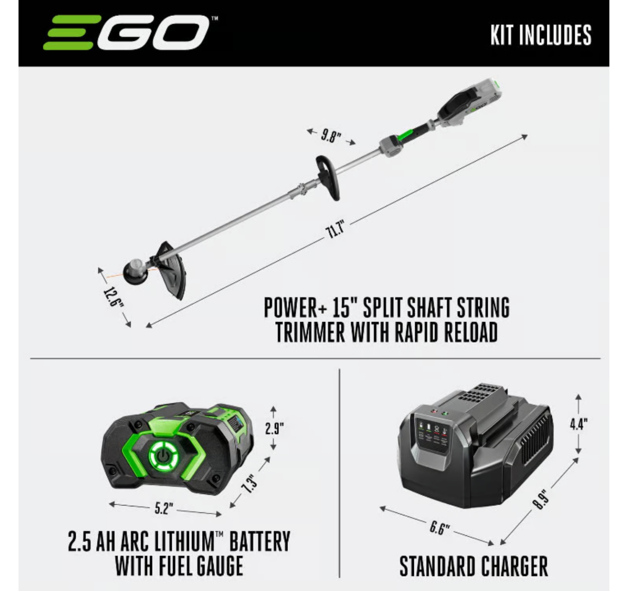 The EGO POWER+ 15" String Trimmer with Rapid Reload head is a convenient upgrade to the EGO String Trimmer family. The Rapid-Reload+ head allows you to insert the line and twist with no alignment, enabling quick and easy reload. With a 15-inch cutting swath and professional-grade 0.095 inch cutting line, yard clean ups are a breeze.