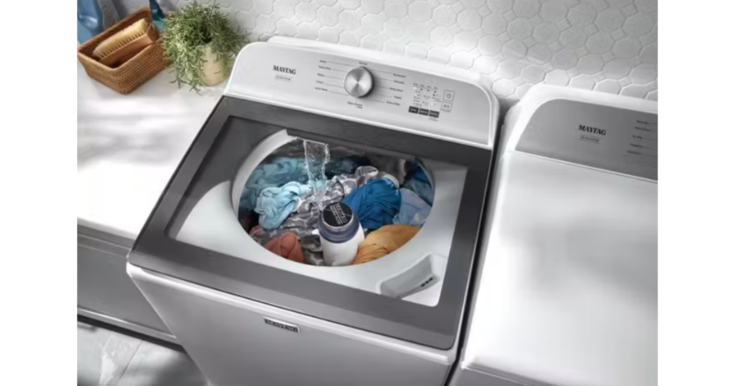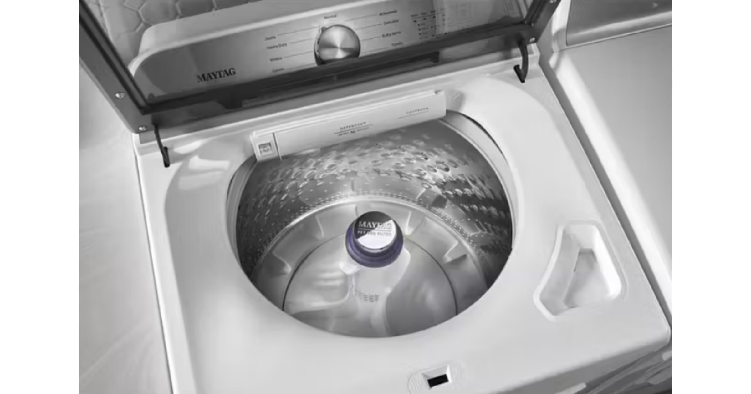 Get a clean you can see with the Maytag® Pet Pro top load washer. This washing machine for pet hair removes 5x more pet hair* with the Pet Pro Filter. Spot treat, rinse or soak clothes with this washer with a built-in faucet and get more water when you want it with the Deep Fill option.