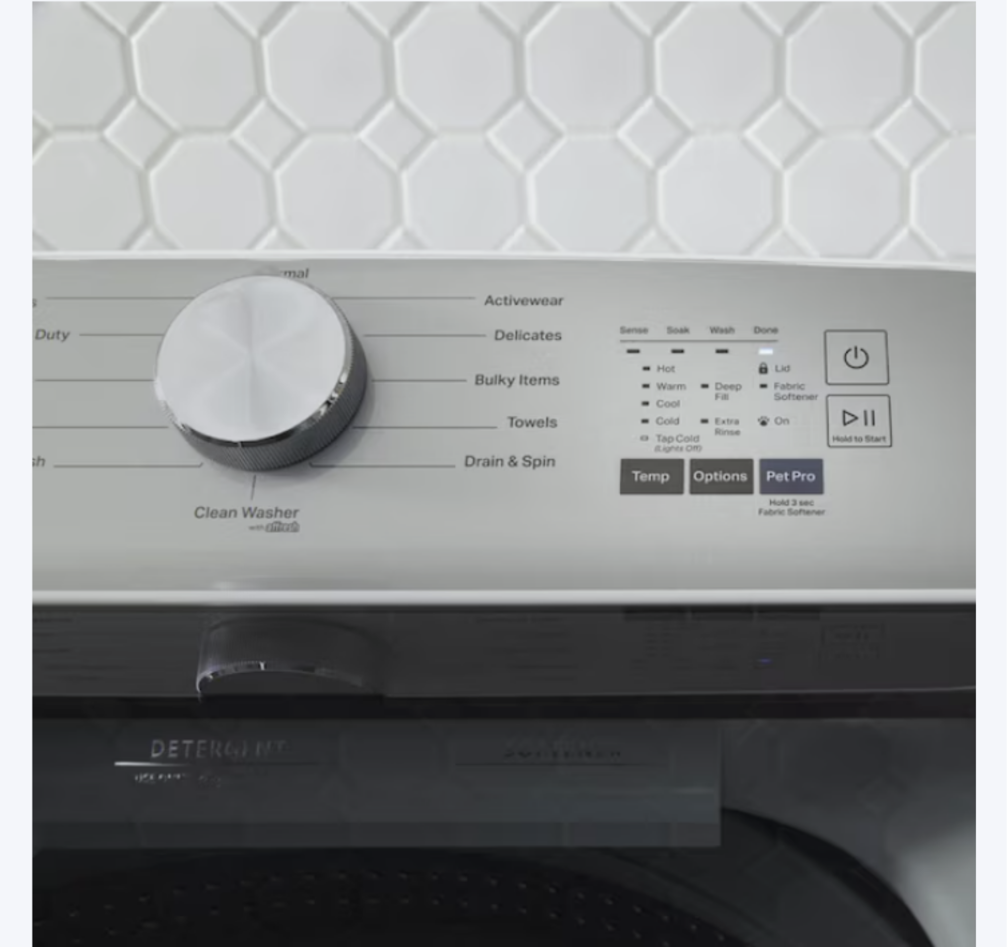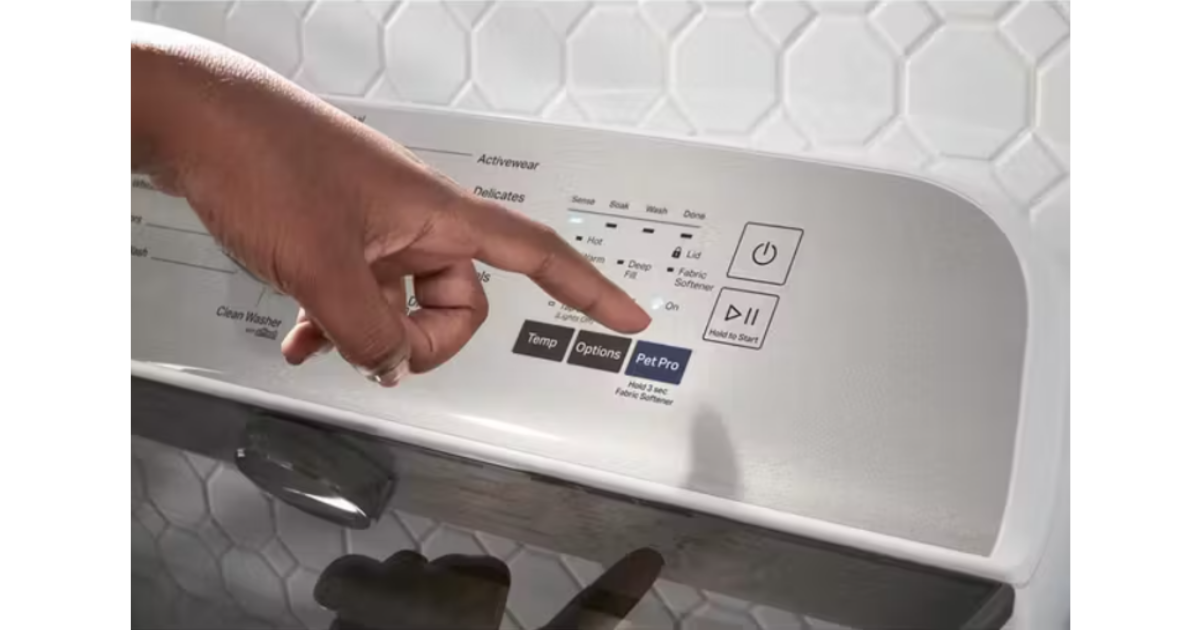 Washer Options: Deep Water, Pet Pro, Quick Wash, Water Faucet, Extra Rinse, Fabric Softener, Temperature