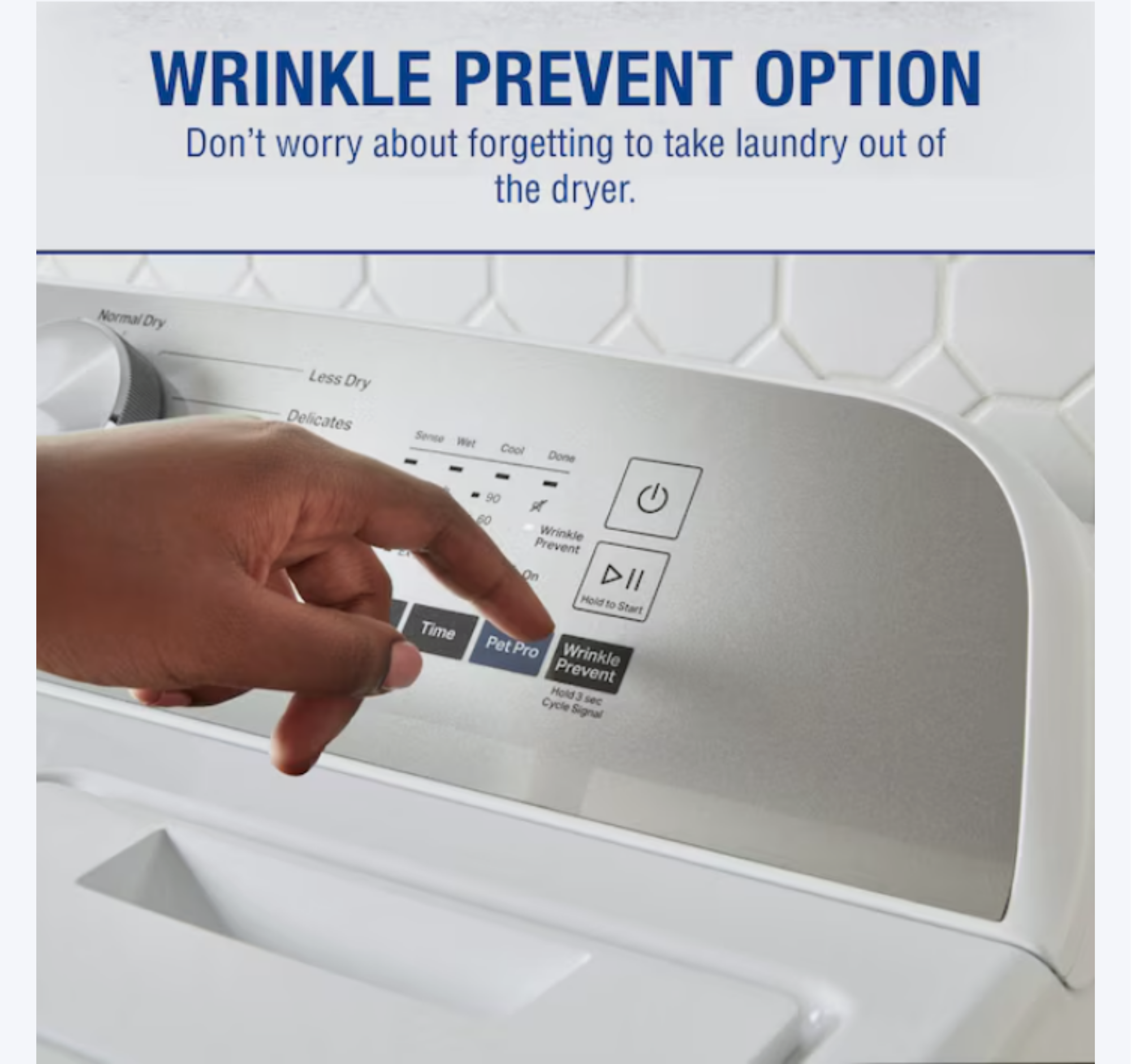 Wrinkle Prevention Option- Don't worry about forgetting to take laundry out of the dryer. The Wrinkle Prevent option tumbles clothes for up to 150 minutes after the cycle ends to help prevent wrinkles from forming.