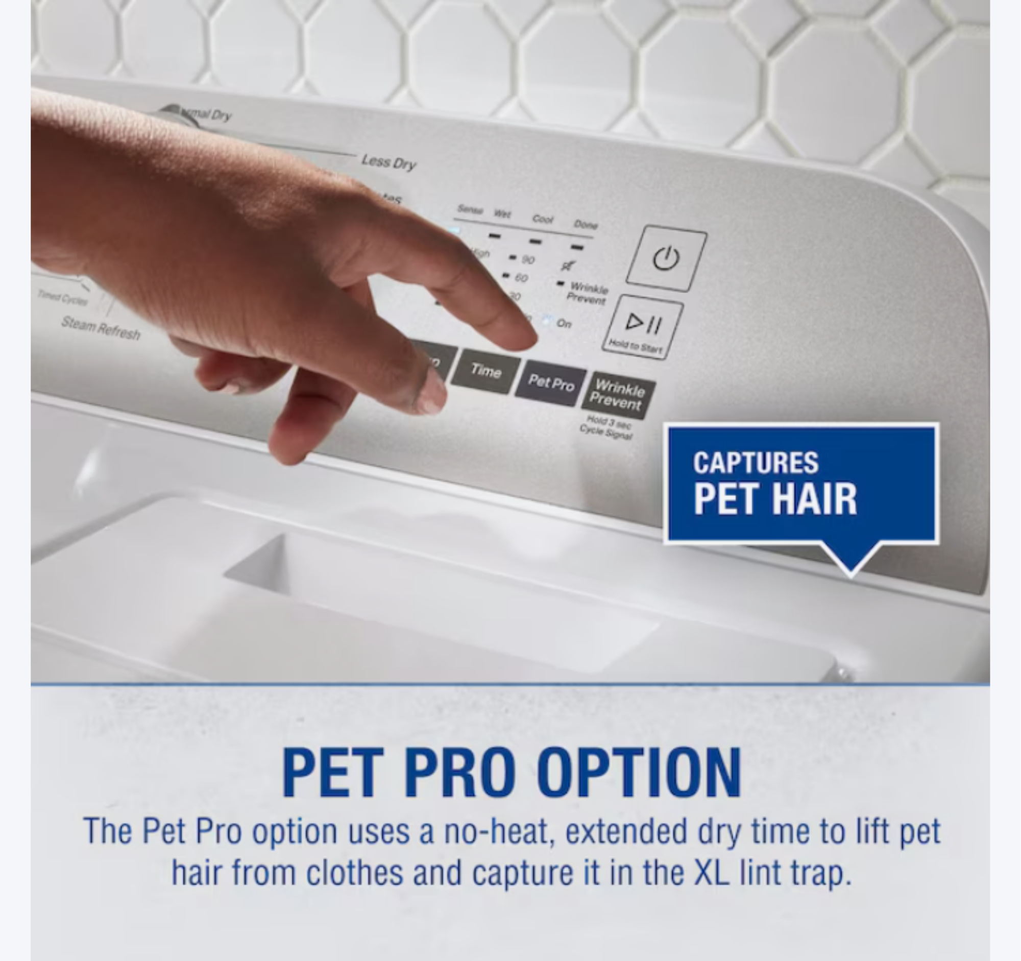 Pet Pro Option- The Pet Pro option uses a no-heat, extended dry time to lift pet hair from clothes and capture it in the XL lint trap.